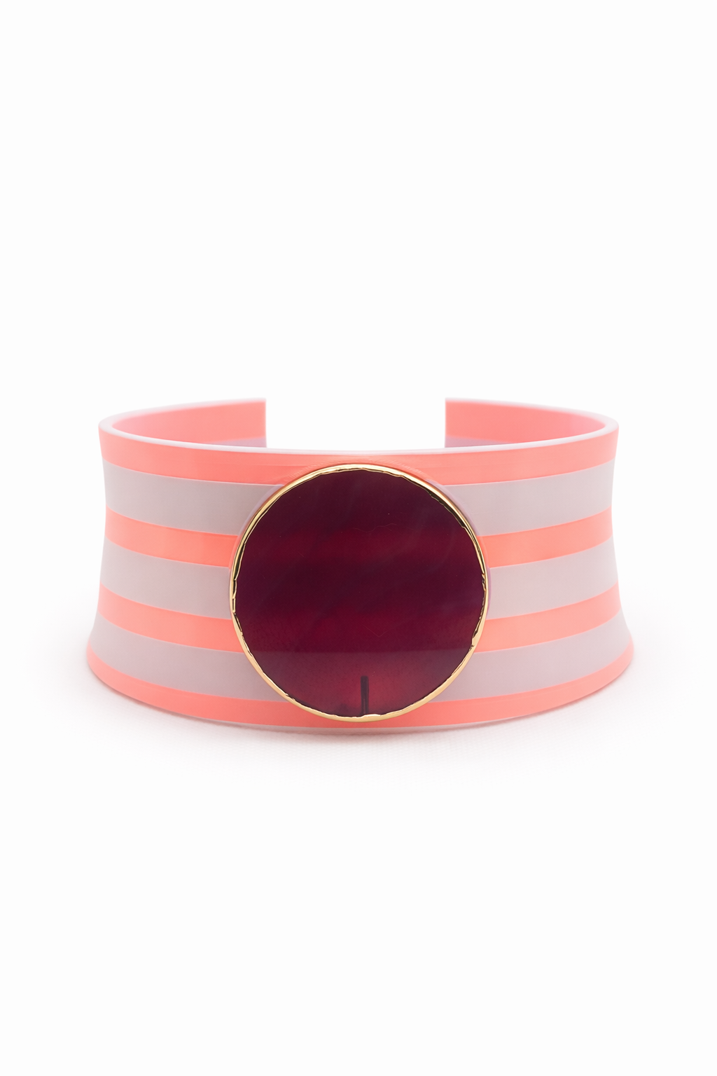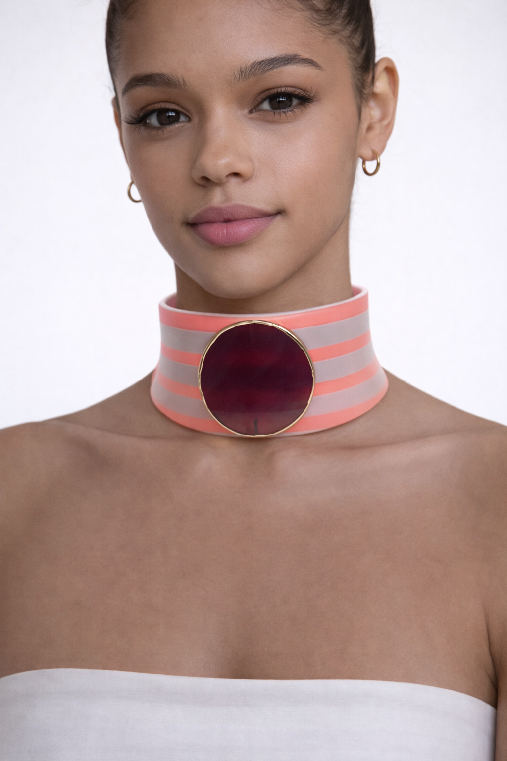 AGATA GLOW STRIPES nasce su base STRONG:una struttura che occupa tutto lo spazio del collo, avvolgente, decisa, presente. Richiede presenza, postura, carattere. Le righe rosa sono realizzate con un filamento luminoso che, al buio, si illumina delicatamente creando un effetto glow.