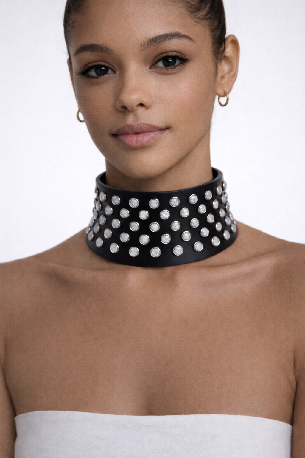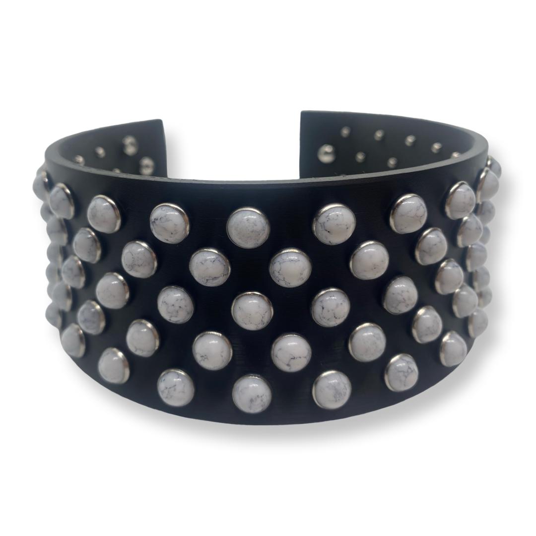 Choker Extra Large con pietre turchesi bianche, realizzato con tecnologia di stampa 3D su base ampia e strutturata. La fascia ampia è impreziosita da pietre turchesi bianche che creano un impatto visivo forte e moderno, pensato per chi ama distinguersi con eleganza. Un choker  audace e luminoso.